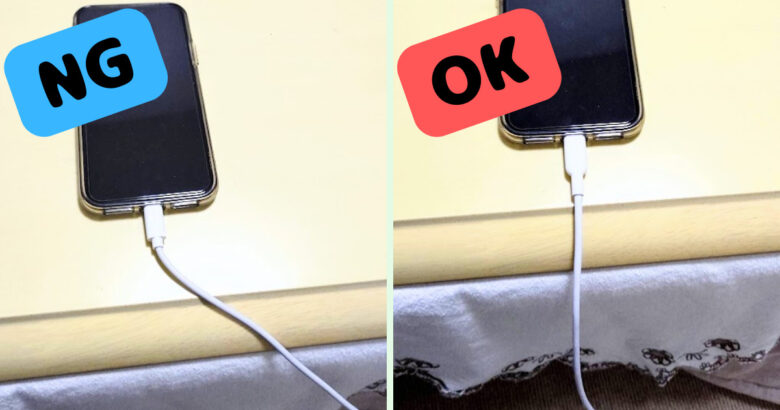 例えば、コンセントは下でスマホをテーブルの上やベッドの上に置いて充電する場合、長さが短いと充電器が張った状態になり、ねじれや曲がりがおきて根本に負荷がかかります。
